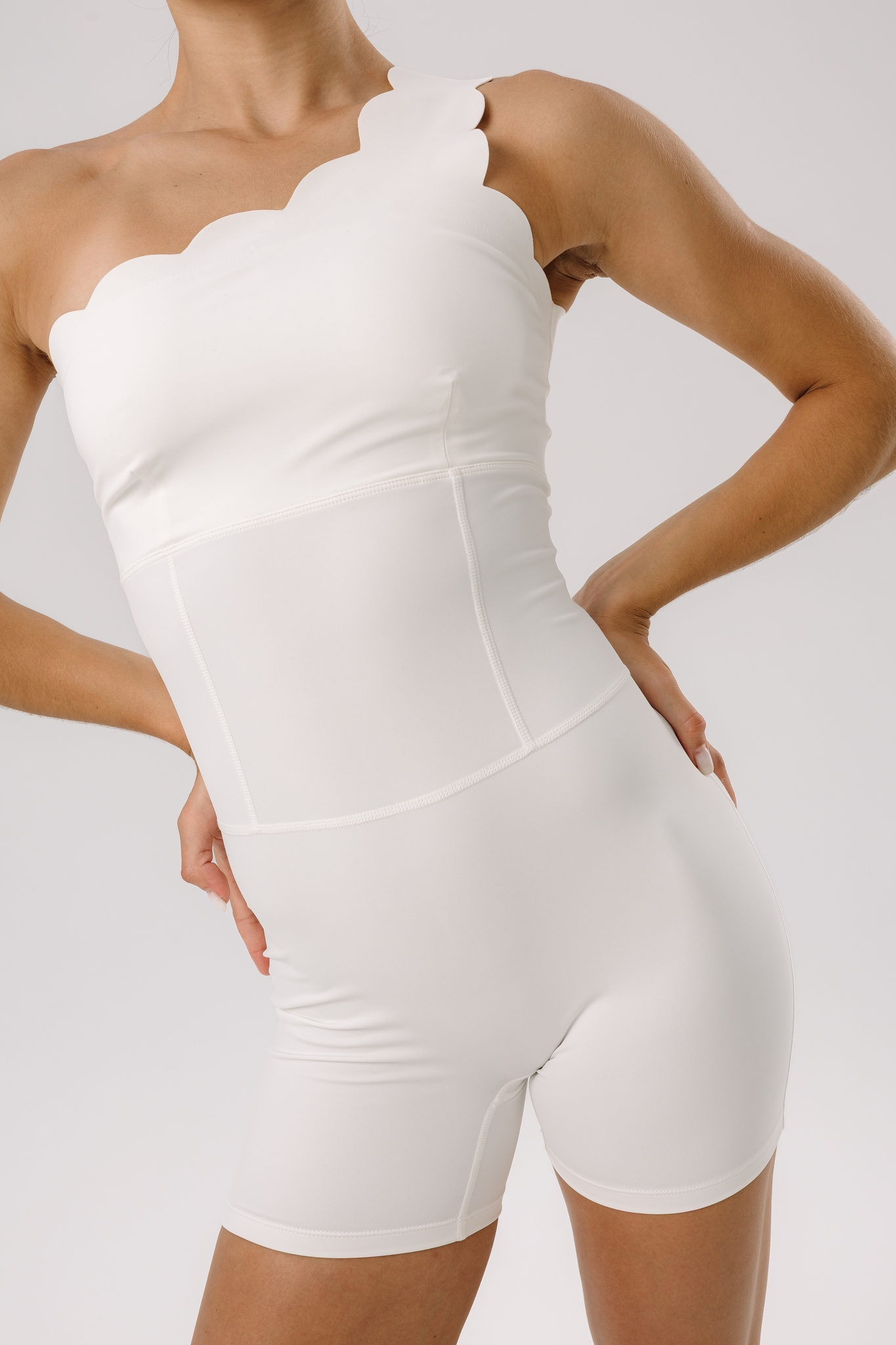 Этот стильный спортивный комбинезон с волнообразным краем на одно плечо сочетает в себе функциональность и модный дизайн. Ассимметричный крой с открытым плечом и декоративной волной добавляет образу женственности и оригинальности Открытое плечо с одной стороны создает эффектный и современный вид. Декоративная волна на плече придает комбинезону изящество и романтичность. Изготовлен из эластичной, дышащей ткани, обеспечивающей свободу движений и комфорт во время тренировок. Встроенный бюстгальтер с умеренной поддержкой подходит для занятий йогой, пилатесом или другими видами фитнеса с невысокой интенсивностью, а также для повседневной носки в качестве стильной и удобной одежды.
