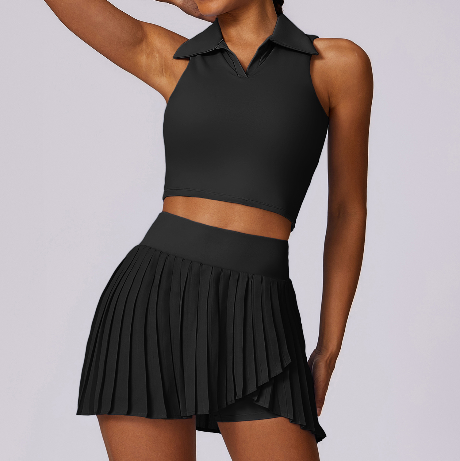 Сочетание легкой юбки и топа с воротником создает стильный и женственный образ, который позволяет чувствовать себя уверенно и комфортно во время тренировок. Юбка выполнена из быстросохнущего материала, который обеспечивает отличную вентиляцию и комфорт во время тренировок. Она имеет среднюю длину, что позволяет свободно двигаться и не стесняет движений. Удобная резинка на талии обеспечивает надежную фиксацию. Топ с воротником придает спортивному образу элегантность и стиль. Воротник выполнен из мягкой ткани, что делает его комфортным для ношения. Такой комплект отлично подойдет как для спортивных мероприятий, так и для повседневной носки, обеспечивая гармоничное сочетание функциональности и модного дизайна.